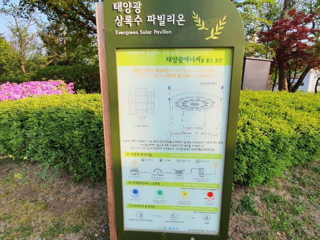 사색의 공간 뒤쪽으로 태양광에너지를 품은 공간 상록수 파빌리온입니다.
