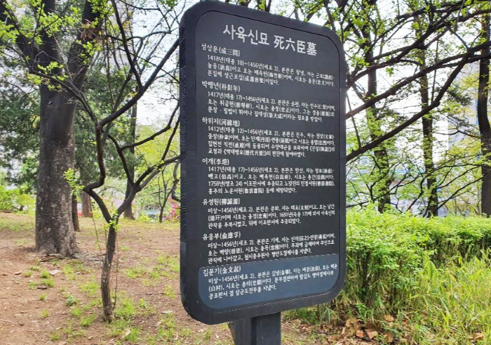 조선 후기 역사적으로 조선왕조의 공식 기록된 충신 여섯 분 외의 한 분은 1970년대 정부의 공원 재단장사업 과정에서 어떠한 정치적인 이유인지 모를 한 분이 추가로 포함되어 지금까지도 논란이 계속되고 있다고 합니다.