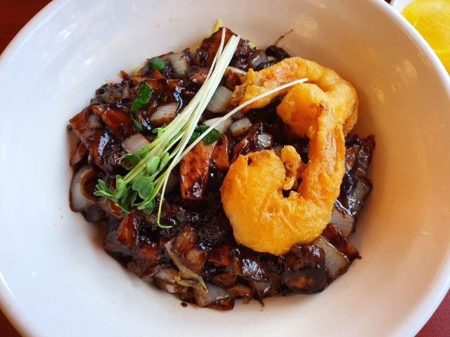 삼선짜장면입니다. 짜장소스 위에 새우튀김 두 마리가 올려있습니다.