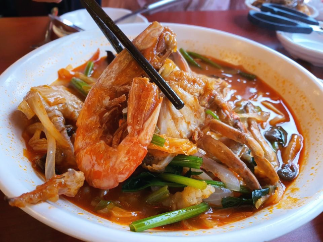 삼선짬뽕입니다. 큼지막한 새우와 반으로 갈린 게와 굴 등등 해물이 가득 보입니다.