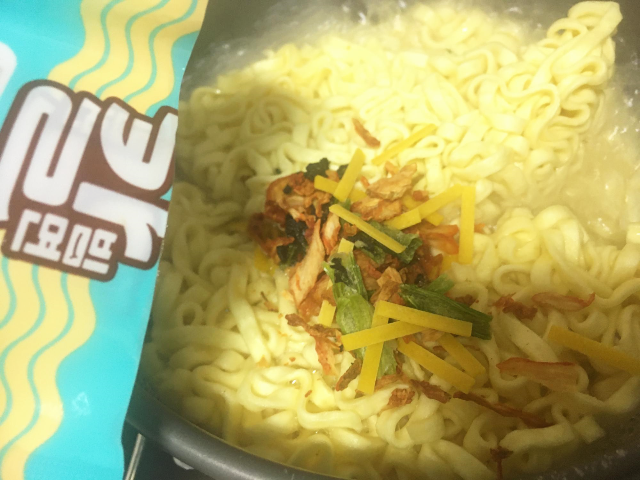 후레이크에는 김치 조각과 계란지단 등 들어있습니다. 김치 조각을 보니 김치면이 생각납니다. 면이 굵어서 5분간 푹 익혀줘야 합니다.