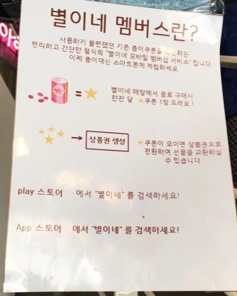 별이네 모바일 멤버십 서비스에 가입하면 음료 1잔당 별 쿠폰 1장을 주는데 별 쿠폰을 상품권으로 전환하여 선물로 교환할 수 있다고 합니다.