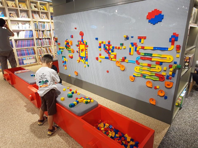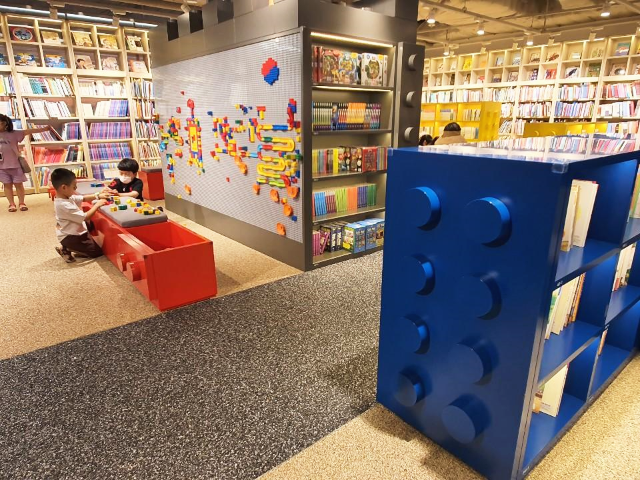 9층 입구 왼쪽으로 어린이 유아 코너가 있습니다. 책장도 블럭 모양으로 꾸며져 있고 아이들 블럭놀이도 할 수 있는 공간도 있어 재미있게 잘 되어 있는데요. 여러 아이들이 블럭을 만지며 노는 모습이 지금 시기에는 조금 염려스러워 보입니다.