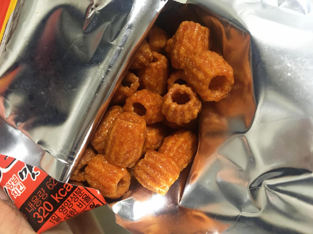 오리온 치킨팝 과자를 가끔 먹곤 했는데 신당동 떡볶이 떡강정 처갓집 양념치킨맛 과자가 더 맛있게 느껴졌습니다. 치킨팝은 그냥 불규칙한 둥그런 모양의 과자지만 신당동 떡볶이 떡강정 양념치킨맛 과자는 가운데가 뚫려있는 짱구과자 모양으로 양념이 뚫려있는 속까지 잘 스며들어서 양념 맛이 진하게 느껴지는 게 맛있었습니다. 오리온 치킨팝의 아류, 미투 상품으로만 보았는데 생각보다 맛있어서 마트 가면 하나씩 챙겨 올 것 같습니다.