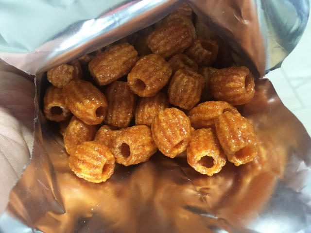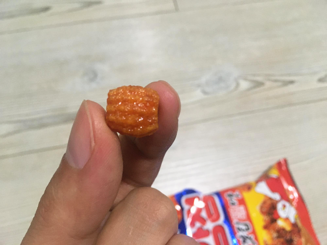 크기는 손톱만한 크기로 하나씩 먹기에는 너무 작은 크기입니다. 모양새는 속이 뚫려있는 게 짱구 과자랑 유사합니다.
