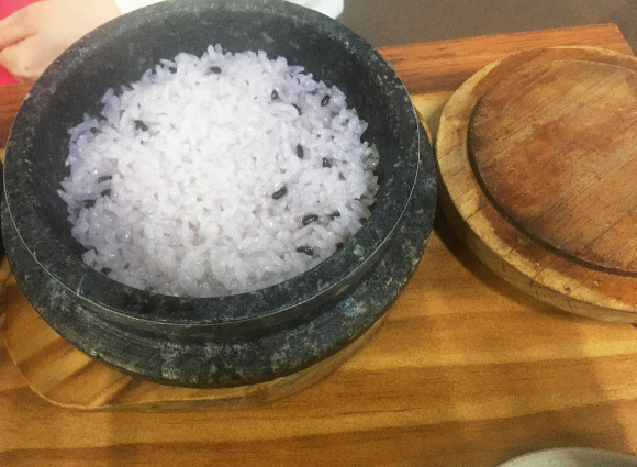 갓 지어진 돌솥밥이 온전한 백미는 아니고 흑미가 살짝 섞여 있습니다. 고슬고슬하게 밥이 맛있게 잘 지어졌습니다. 밥을 공기에 덜어 낸 후에 물을 붓고 뚜껑을 덮으면 마무리로 숭늉을 먹을 수 있습니다.