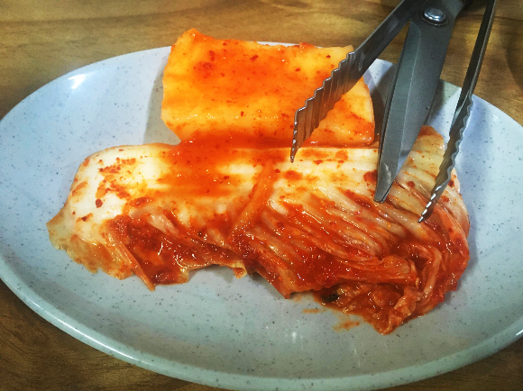 김치와 무는 항상 하나씩 주시며 알아서 적당한 크기로 잘라먹으면 됩니다. 이곳의 김치는 약간 심심한 맛이고 깍두기 무는 김치보다는 조금 익은 상태로 나와서 새콤달콤 합니다.