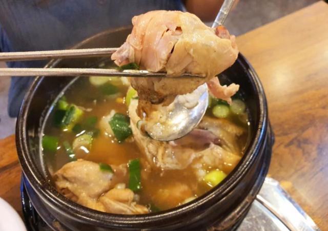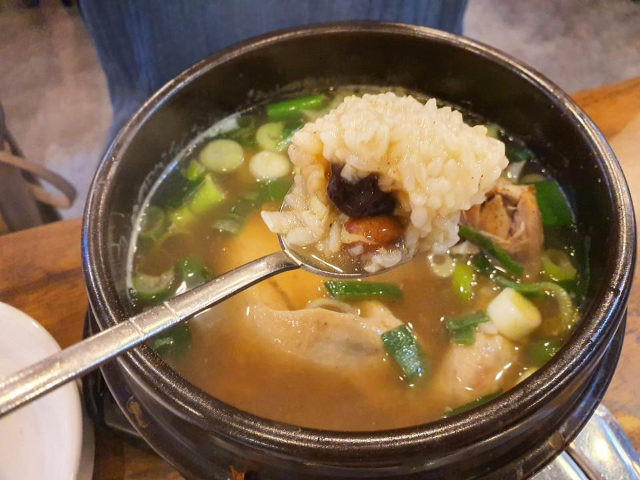 죽염삼계탕입니다. 진득한 국물에 약초 향이 가득한 진한 맛의 국물입니다.