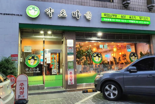 약초마을 본점입니다. 주차는 지하주차장을 이용할 수 있고 식당 앞 공간에는 2~3대의 주차공간이 있습니다. 복날에는 식당 앞 주차장은 대기공간으로 쓰일 수도 있습니다.