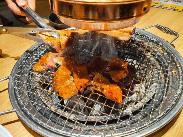 숯불의 불판 위로 고기를 빠르게 구워봅니다.