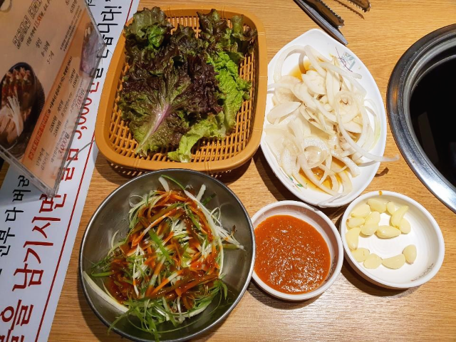 기본 반찬입니다. 양파절임, 파절임, 상추와 마늘입니다.