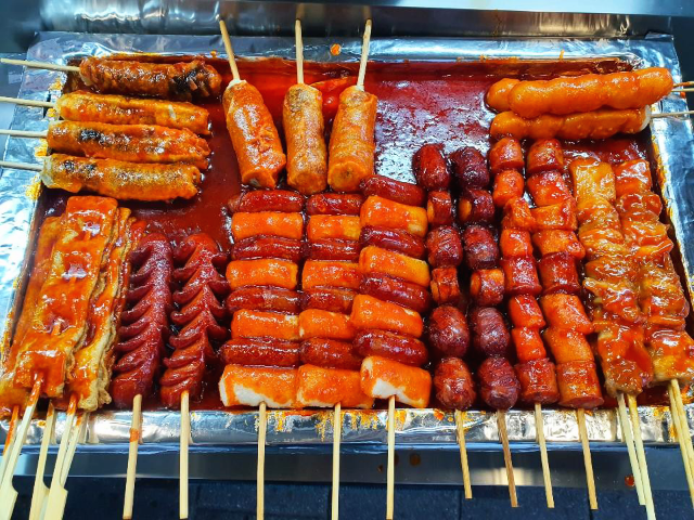 다양한 꼬치들이 빨간 양념에 담겨 있는 모습이 먹음직스럽게 보입니다. 저는 기본적인 떡꼬치와 김말이꼬치를 좋아합니다.