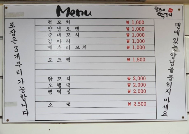 털보네떡꼬치 메뉴와 가격입니다. 1천원대 가격으로 조금 오른 것 같습니다. 떡꼬치부터 순대꼬치와 메추리꼬치 등 여러가지 꼬치가 있어서 골라 먹기가 좋습니다. 포장도 가능하고 포장은 종류에 상관없이 3개부터 가능하다고 합니다. 깔끔하게 진공포장해주셔서 냄새 걱정 없이 장거리 가는 길도 괜찮을 것 같습니다.