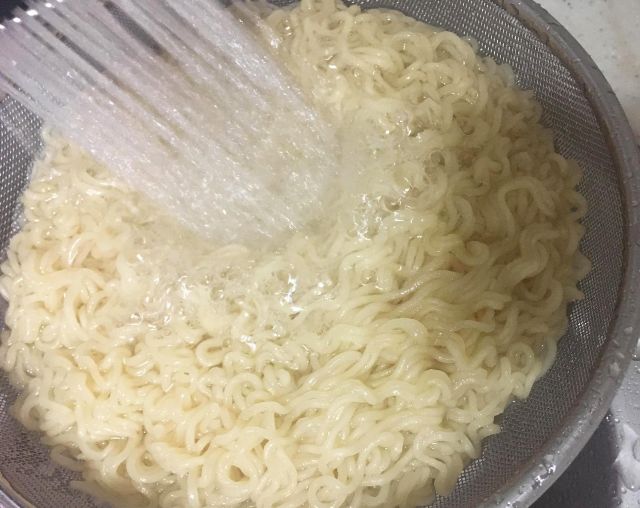 ②면이 알맞게 익으면 체에 밭쳐 냉수로 3~4회 헹구어 물기를 완전히 뺍니다.