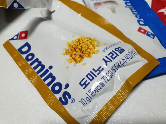 다른 소스는 안 뿌려먹어도 시리얼 칠리크랩은 이름이 시리얼인 만큼 시리얼을 뿌려먹어 보았습니다. 시리얼을 뿌려서 바삭한 식감이 나는데요. 저는 시리얼의 바삭함이 부드러운 피자와 식감으로서는 잘 안 맞는 느낌이었습니다. 시리얼 맛은 달고나 부셔놓은 것처럼 달달하면서 짭짭한 맛이 좋기는 했습니다.