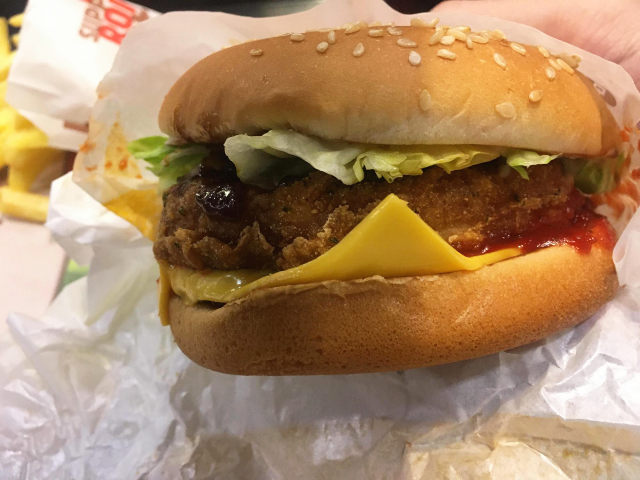 비프 패티와 치킨 패티로 두 개의 패티로 구성되어 있습니다. 압축되어서 잘 보이지는 않네요. 소스는 기본 소스에 매콤한 소스가 섞여있습니다.