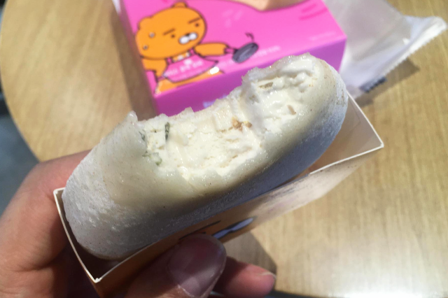 하얀 호떡에 인절미 가루가 묻어있습니다. 박스에 라이언 얼굴과 같이 해놓으니 귀엽습니다.