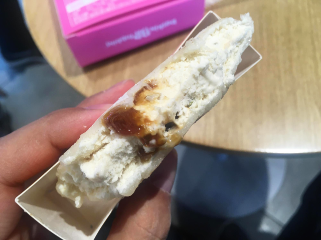 한 입 먹어보았습니다. 겉은 쫀득쫀득하면서 속의 아이스크림은 시원합니다. 호떡의 맛이 조금 느껴지기도 하고 옛날에 자주 먹던 찰떡아이스와 비슷하기도 합니다. 호떡의 포인트는 달달한 꿀맛인데요. 한 입 먹어서는 꿀 시럽이 보이지가 않았습니다. 더 먹어보았습니다.
