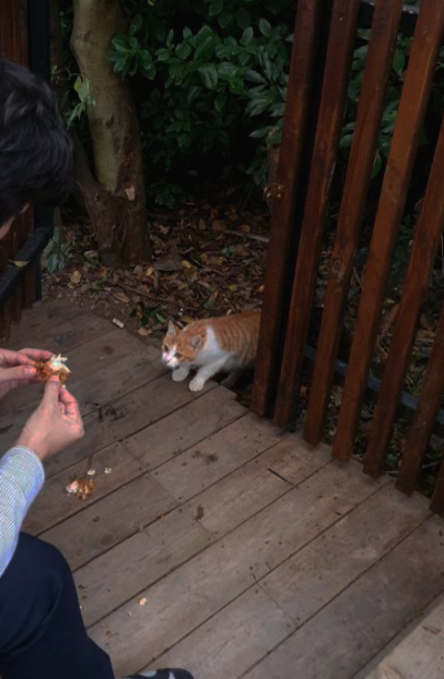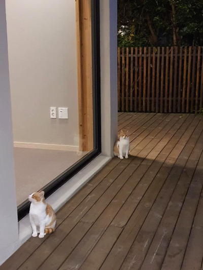 저녁식사 시간이 되니 바비큐 먹을 줄 알고 귀여운 고양이 두 마리가 기다리고 있는 것 같았습니다.
