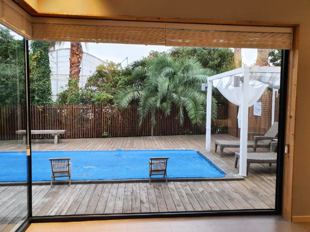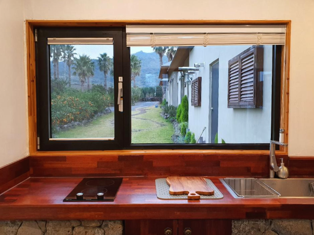 거실 오른쪽으로는 프라이빗한 수영장이 있습니다. 저희는 2박을 하면서 이틀 연속 온수풀을 예약하였습니다. (온수풀 추가 요금 있음) 이용할 시간을 미리 말씀드리면 그 시간에 맞춰서 온도를 맞춰주십니다. (날씨가 추워 준비된 물이 식었을 때 다시 말씀드리면 온도 맞춰주신다고 합니다)