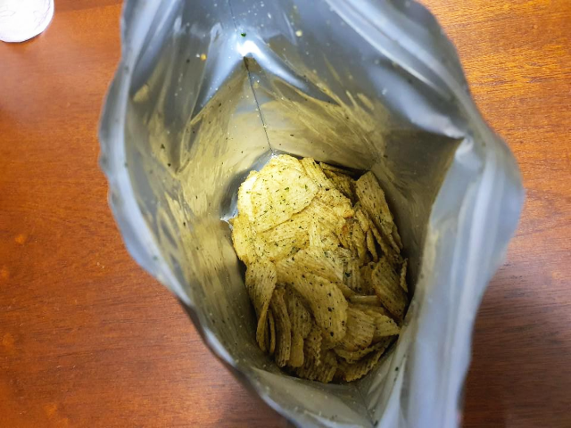 봉지가 굉장히 빵빵합니다. 부서지기 쉬운 감자칩이라서 질소를 한가득 넣은 것 같습니다. 질소에 과자가 딸려온 건 아닌지 걱정도 됩니다. 깡패 같은 가격으로 빵빵한 봉지가 근육 깡패같이 느껴집니다.