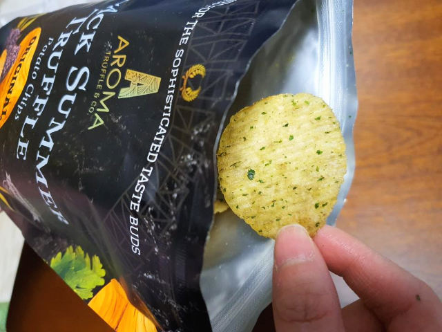 아로마 블랙 썸머 트러플 토테이토 칩스 (오리지널)입니다. 일명 트러플 감자칩입니다. 이 과자 한 봉지가 만원 가까이한다니 까만 과자봉지에 빵빵함이 뭔가 달라 보이기도 합니다.