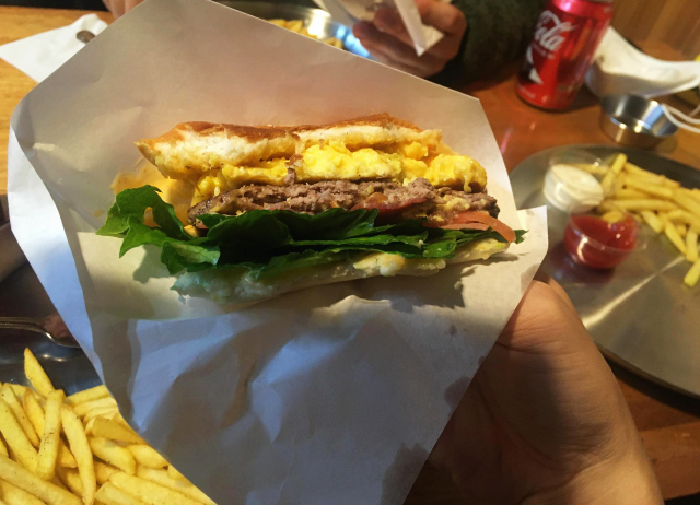 지못미버거를 먹어보았습니다. 굉장히 부드럽고 맛있었습니다. 빵은 두툼하면서도 퍽퍽하지 않고 식빵처럼 부드러웠으며 에그스크럼블이 부드러운 느낌을 더욱 살려주었습니다. 소고기패티는 잘게 다져서인지 얇게 느껴져 씹는 식감은 거의 없었지만 고기의 풍미는 괜찮았습니다. 양상추가 아닌 로메인 상추로 먹으니 부드러움보다 억쎈 느낌이 있지만 신선한 느낌이 좋아서 햄버거에 잘 어울렸습니다. 지못미소스와 치즈의 조합도 느끼하지 않게 단짠의 맛이 좋았습니다. 베이컨의 맛이 조금 약해서 아쉬웠지만 전체적으로 느끼하지 않고 부드러운 느낌이 너무 좋았습니다.
