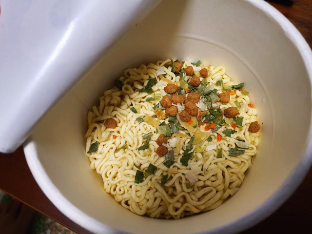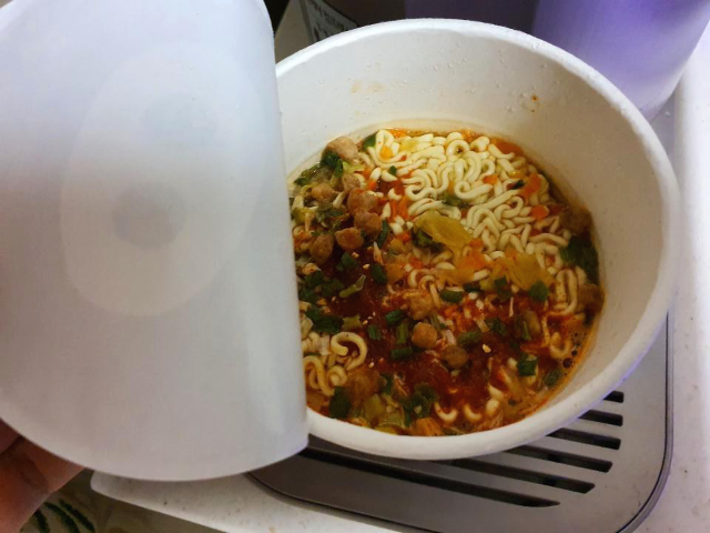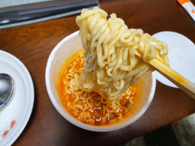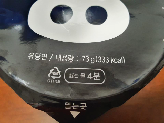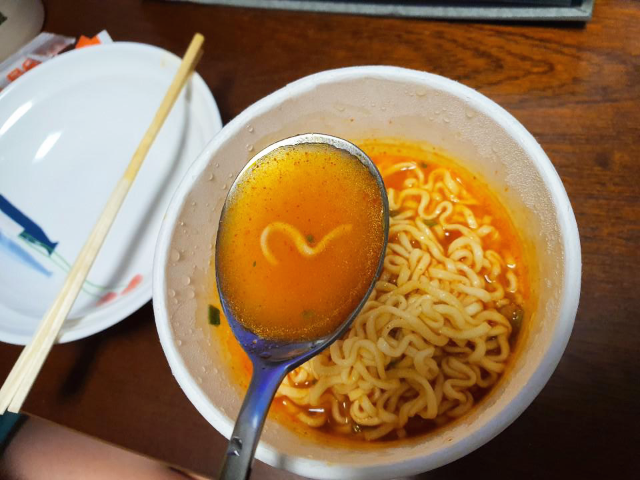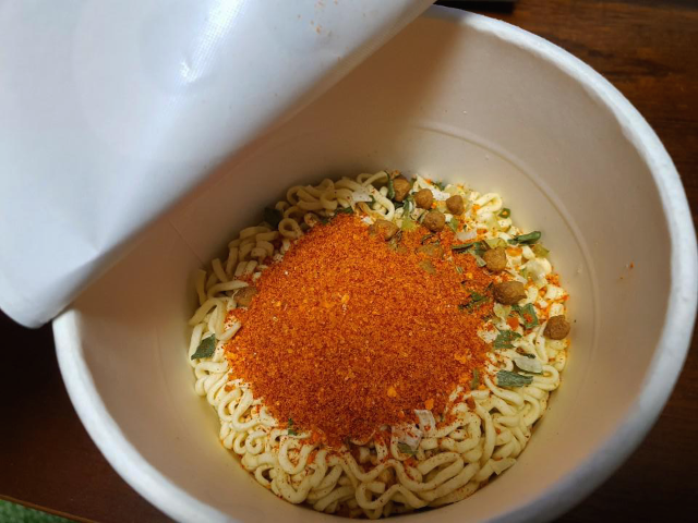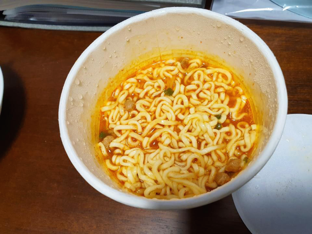 일단 용기의 안쪽 선까지 끓는 물을 붇고 4분간 기다려보기로 했습니다. 4분을 기다리면서 나는 왜 돗멘을 돈코츠라멘으로 착각했을지 자책을 하였습니다. 사실 돗멘이 일반 빨간 국물의 라면인걸 알았다면 안 샀을 수도 있다는....