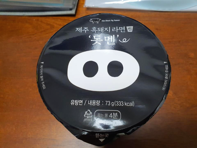 돗멘 컵라면 위에서 본 모습입니다. 흑돼지 모습으로 형상화하여 돼지 콧구멍이 보입니다.
