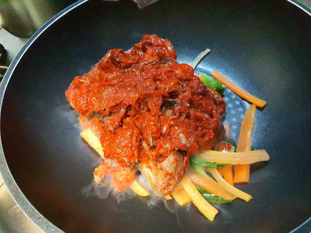 같이 볶은 채소들과 함께 먹어보았습니다. 적당히 볶아서인지 오동통한 쭈꾸미가 쫄깃하고 맛있었습니다. 한입에 먹기 좋은 크기로 쫄깃한 식감도 제대로 느끼고 괜찮았습니다. 양념은 전혀 매콤하지 않고 안 매운 고춧가루의 맛만 느껴져서 아쉬웠습니다.