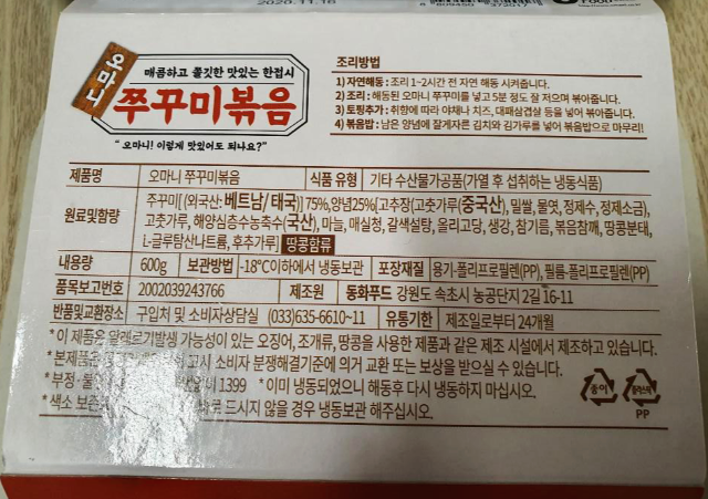 중량은 양념 포함 600g으로 쭈꾸미 75% 양념 25%, 쭈꾸미는 태국산입니다. 냉동식품이라서 보관도 용이한 것 같습니다.