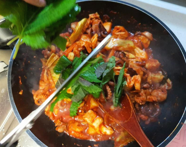 그래서 깻잎도 넣어보았습니다. 아내 분께서 깻잎을 좋아하셔서 넣은 이유도 있습니다. 깻잎까지 넣고 적당히 볶아주면 끝입니다.