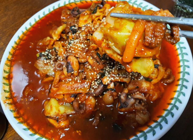 오동통한 쭈꾸미 살들이 보이면서 양배추도 넣고 볶다보니 닭갈비인지 순대볶음인지 비슷한 비주얼이 되어가고 있습니다.