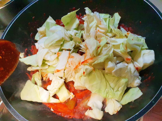 어느 정도 볶다 보니 국물은 자박하게 생겼습니다. 그래서 추가로 양배추를 넣어보았습니다.