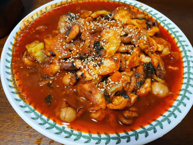 마무리로 깨까지 뿌려주면 오마니쭈꾸미볶음 완성되었습니다.