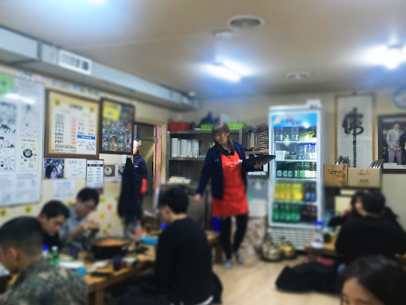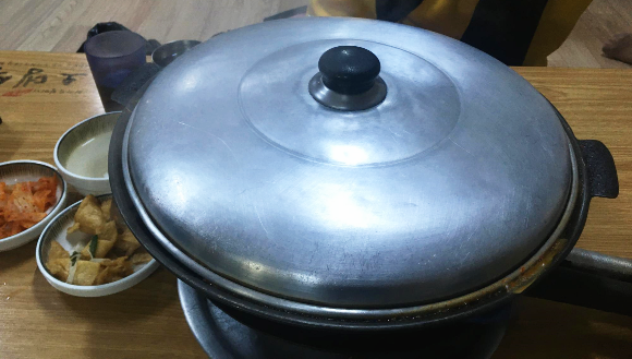 이제 뚜껑을 닫고 끓기만을 기다립니다. 여기서 중요한 포인트가 있습니다. 절대 절대 뚜껑을 열어서는 안 됩니다. 잘 끓고 있는지 너무 끓어서 넘치지는 않을지 라면과 당면은 바닥에 붙어서 먹기 힘든 건 아닌지 이모님께서 우리 꺼만 잊어버리시고 안 열어 주시는 건 아닌지 별일 별 생각이 다 들겠지만 참고 인내하여 기다려야 합니다. 그래야 오뎅식당의 부대찌개의 참맛을 느낄 수 있습니다. 혹시나 하는 마음에 뚜껑에 손이 가면 이모님들의 불호령이 떨어집니다. 그 손 놓으시오! 그만큼 맛에 대한 확고한 레시피와 철학이 있는 것 같아서 좋아 보였습니다.