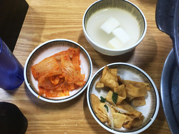 먼저 밑반찬이 나왔습니다. 김치, 오뎅, 동치미 세 가지입니다. 김치는 신맛이 조금 강하게 감도는 게 묵은지 같았습니다. 동치미는 일반 식당 동치미와 다르게 사이다 맛의 탄산과 단맛이 거의 없고 짠지 같은 짠맛이 강했습니다. 어렸을 때 할머니가 담가주셨던 동치미 맛이랑 같아서 맛있었습니다. 오뎅은 튀김 맛이 강한 게 두 번 튀겨낸 거 같은 식감에 달달하니 얼큰한 부대찌개와 어울릴 맛이었습니다.