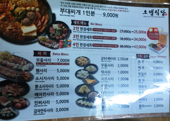 둘이서 방문 했기 때문에 2인 한정세트(부대찌개2인+모둠사리+음료1)로 주문했습니다. 오뎅식당에 처음 왔을 때 놀랐던 것은 사리 가격이 비싸다는 것이었습니다. 양이 얼마나 되는지 보지는 못했지만 모둠사리 가격이 부대찌개 1인분과 비슷합니다.