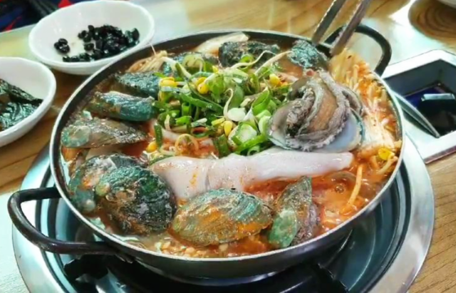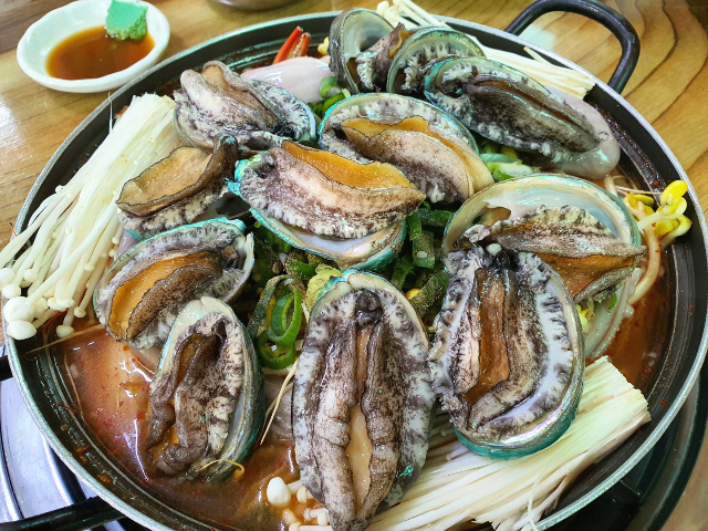 그리고 바로 해물탕이 나왔습니다. 싱싱한 전복이 가득 담겨 나왔습니다. 살아있는 활전복입니다.
