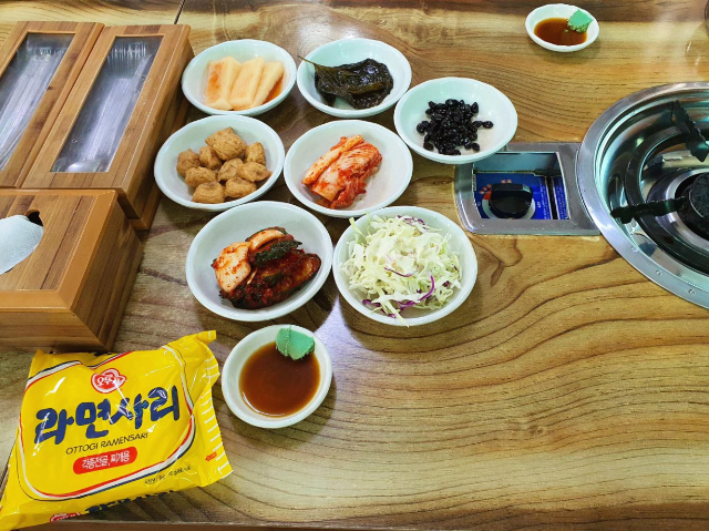 밑반찬과 라면사리가 먼저 나왔습니다. 깻잎, 콩자반, 어묵, 김치 등과 간장베이스 소스입니다.
