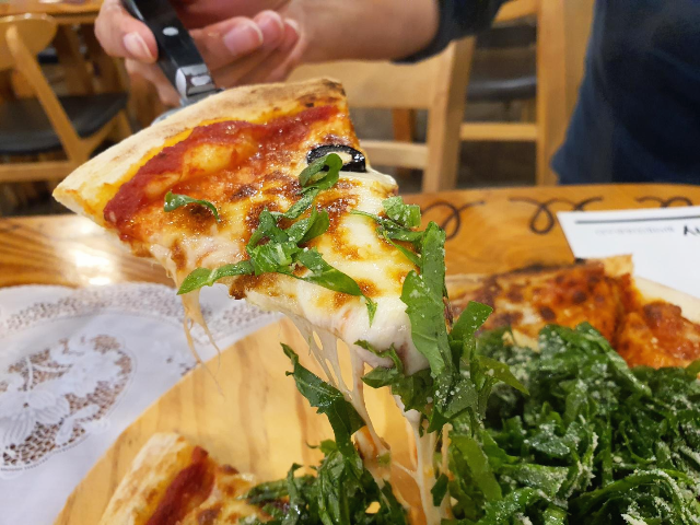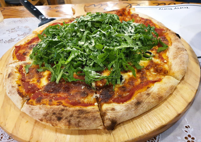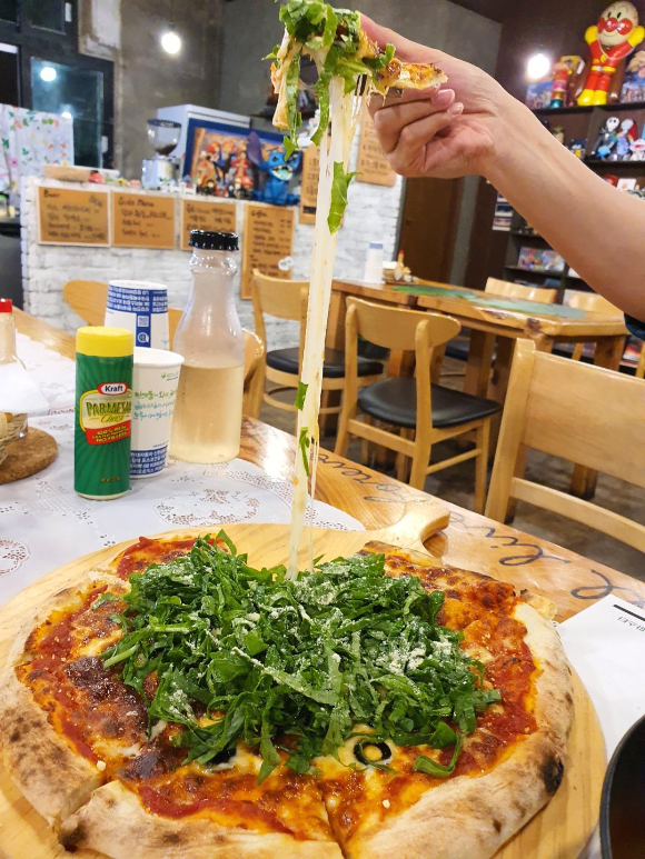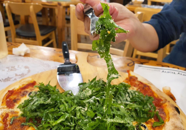 기대가 되었던 유채피자입니다. 주방이 오픈되어 있는데 화덕에 굽는 모습은 안 보여서 조금 아쉬웠지만 에어버블과 도우 끝부분을 보니 화덕에 잘 구워져 나온 모양새는 하고 있었습니다. 유채피자라고해서 노오란 유채꽃도 조금 있을 줄 알았는데 파란 잎사귀만 올려져있었습니다.