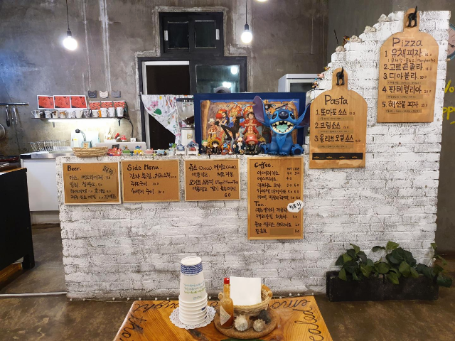 벽면에 메뉴가 나와있습니다. 간단한 주류와 음료 메뉴가 있고 피자 메뉴로는 유채피자, 고르곤졸라, 디아볼라, 판테렐리아, 해산물피자가 있고 파스타는 토마토소스, 크림소스, 올리브오일소스 3가지가 있었습니다. 유채피자라는 새로운 피자가 눈에 띄었습니다. 유채꽃이 들어가는 것 같아서 제주도에서 먹는 피자니까 유채피자를 주문하고 파스타는 토마토소스 파스타를 주문하였습니다.