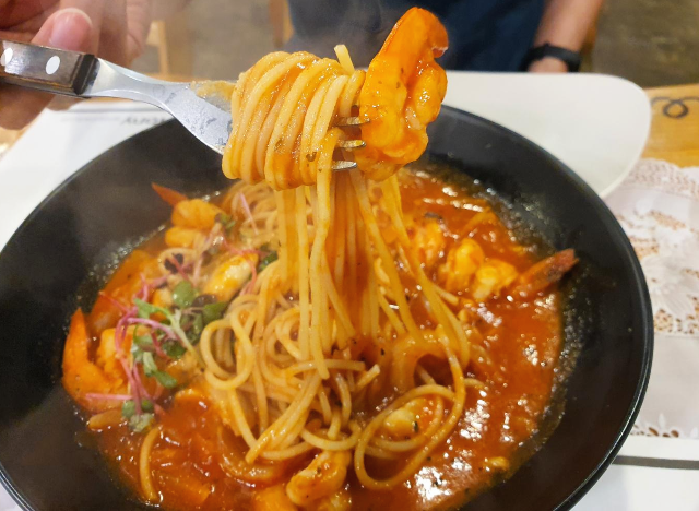 토마토소스 파스타 먼저 먹어보았습니다. 면은 적당히 삶아서 부드럽고 쫄깃하게 넘어가고 새우는 아주 탱글탱글 맛있었습니다. 소스는 살짝 매콤하면서 단맛은 조금 약한 편입니다. 사장님께서 직접 수제로 만든 소스다보니 제 입맛에는 좋은데 다른 분들은 살짝 심심하게 느껴질 수도 있을 것 같습니다. 간이 살짝 심심해서 소스를 많이 주셨는지 모르겠습니다.