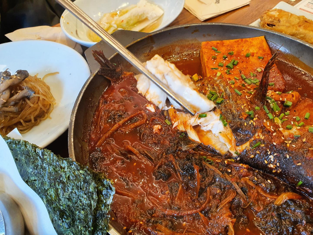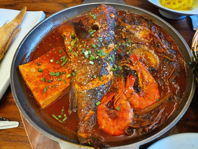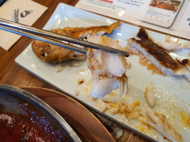 고집돌우럭입니다. 먹어보겠습니다. 양념 속에 우럭의 하얀 속살이 부드러운 게 맛있었습니다. 조림의 양념은 살짝 매콤하면서 단맛이 강하게 느껴졌습니다. 단맛이 강해서 떡볶이 양념 맛에 비슷했고 처음에 먹을 때는 단맛이 강하게 느껴지다가 계속 먹으면서 단맛이 점점 무뎌졌습니다.