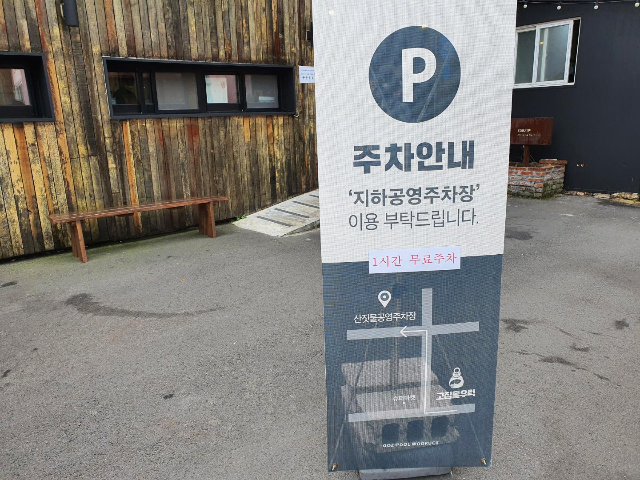 고집돌우럭 가게 앞 주차장에는 주차를 못하고 근처 지하공영주차장 안내를 받아 가서 주차를 하였습니다. 근처에 있는 지하공영주차장인 산짓물공영주차장도 주차장이 큰 편이 아니라서 차가 거의 가득 들어차서 주차하기 조금 힘들었습니다.