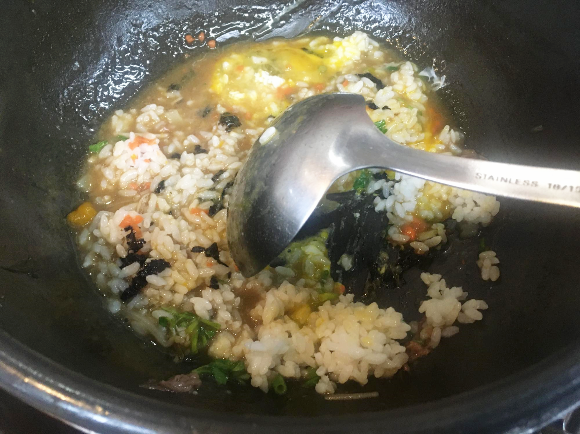 칼국수 먹고 남은 국물은 자박하게 만들고 죽을 만듭니다. 전에는 주인 아저씨께서 해주셨는데 지금은 자주 오다 보니 제가 알아서 해 먹습니다. 자박한 국물에 밥과 계란을 잘 풀어주면서 계속 저어주면 완성됩니다. 어렵지 않습니다.