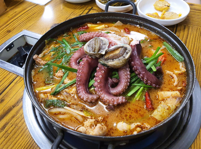 올랭이와물꾸럭입니다. 문어 위에 전복도 올려져 있습니다. 비주얼로만 보면 들깨가루가 팍팍 들어간 보양식 국물입니다.