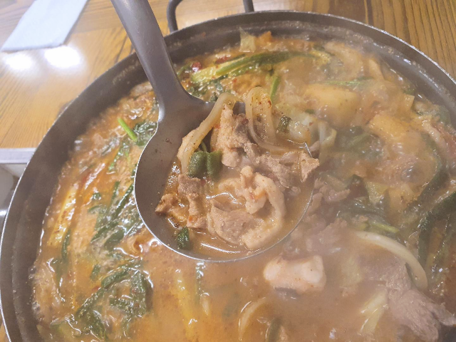 오리고기도 먹어보았습니다. 어느 정도 익혀 나온 음식이라 오리고기가 부드러우면서 쫄깃한 식감이 살아있습니다. 부들부들 넘어가는 고기에 국물 한 스푼 또 먹습니다. 먹다 보면 오리전골에 가까운 느낌입니다.
