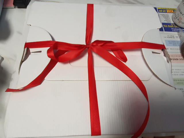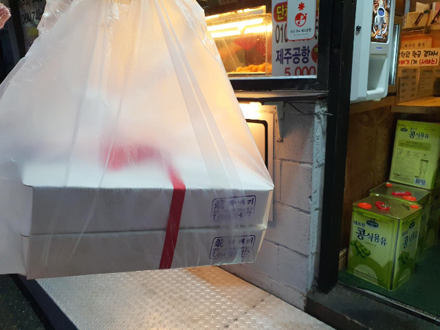 빨간 리본으로 꼼꼼하고 예쁘게 묶인 용꽈배기 박스를 육지까지 잘 모시고 왔습니다. 냄새 때문에 비행기에서 다른 분들께 피해가 되지 않을까 걱정 했었는데요. 생각보다 포장이 잘되어서 다행히 별탈없이 잘 가져왔습니다.