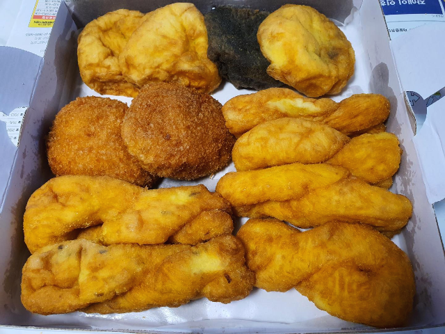 용꽈배기 세트입니다. 왼쪽부터 대파꽈배기, 고로케, 팥도넛, 꽈배기 입니다.